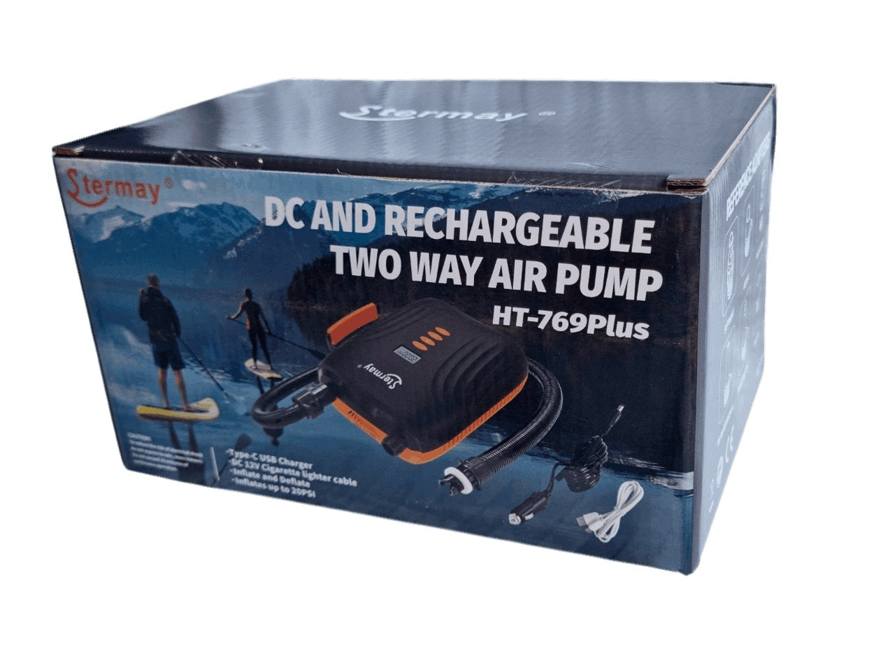 A powerful, programmable, intelligent, portable electric two-stage air pump for inflating inflatable boats, including boats with AirDeck floor, SUP boards, kayaks, RIBs and other inflatable products.
