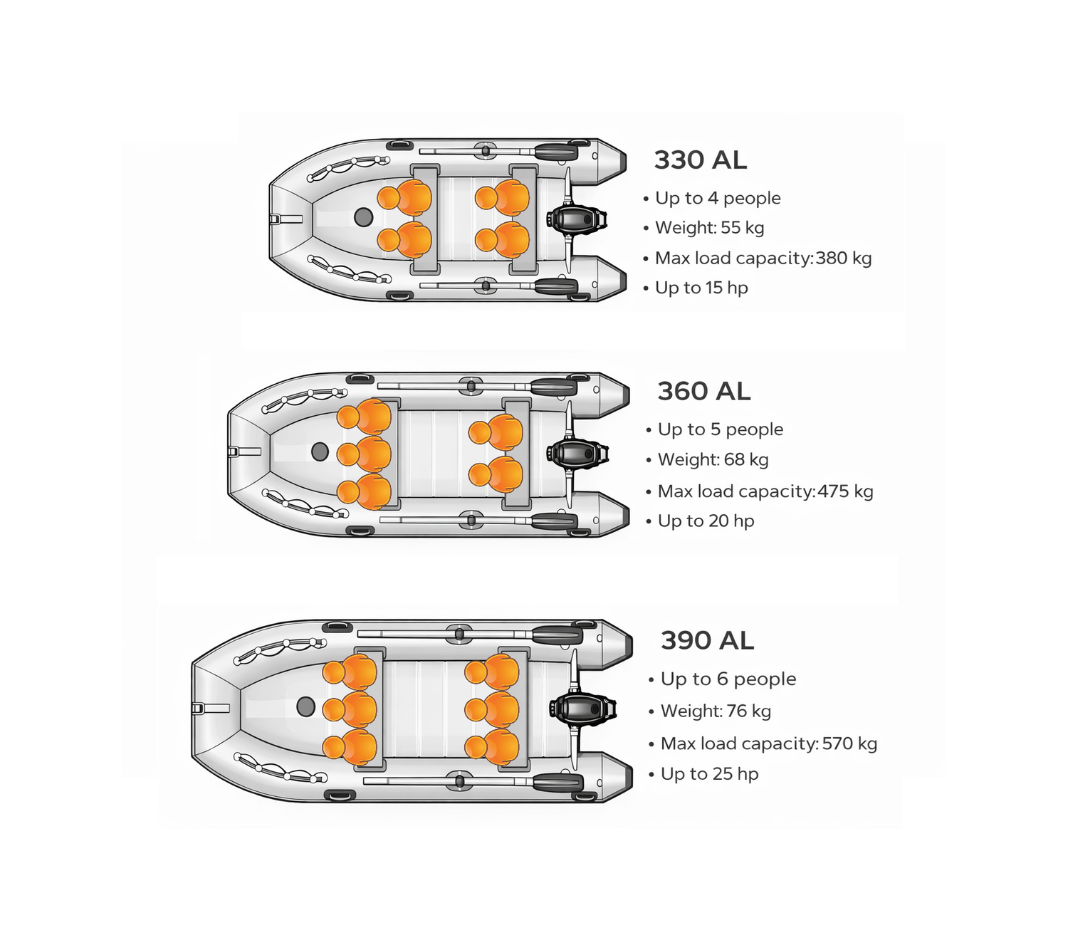 Ja skatāmies pēc modeļiem, 330 AL ir praktiska izvēle diviem cilvēkiem un vieglākiem izbraucieniem. 360 AL piedāvā vairāk vietas iekšpusē un labāk der regulārai makšķerēšanai, papildu ekipējumam un universālākai lietošanai. 390 AL ir ietilpīgākais modelis līnijā, kas piemērots nopietnākai slodzei, smagākam aprīkojumam un līdz sešiem cilvēkiem.