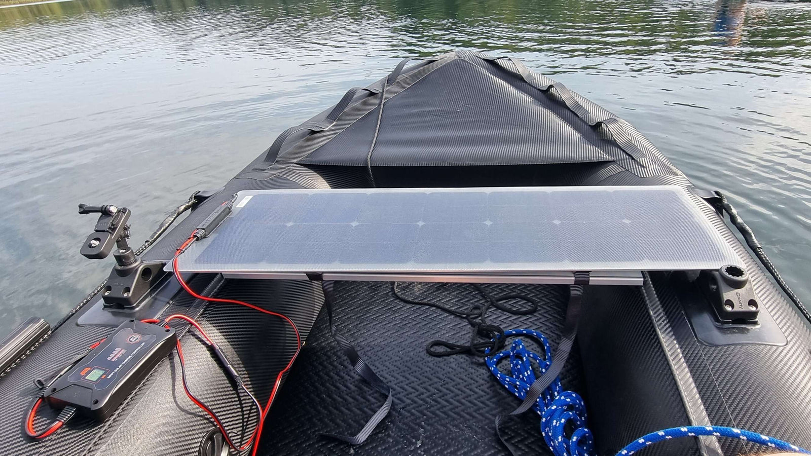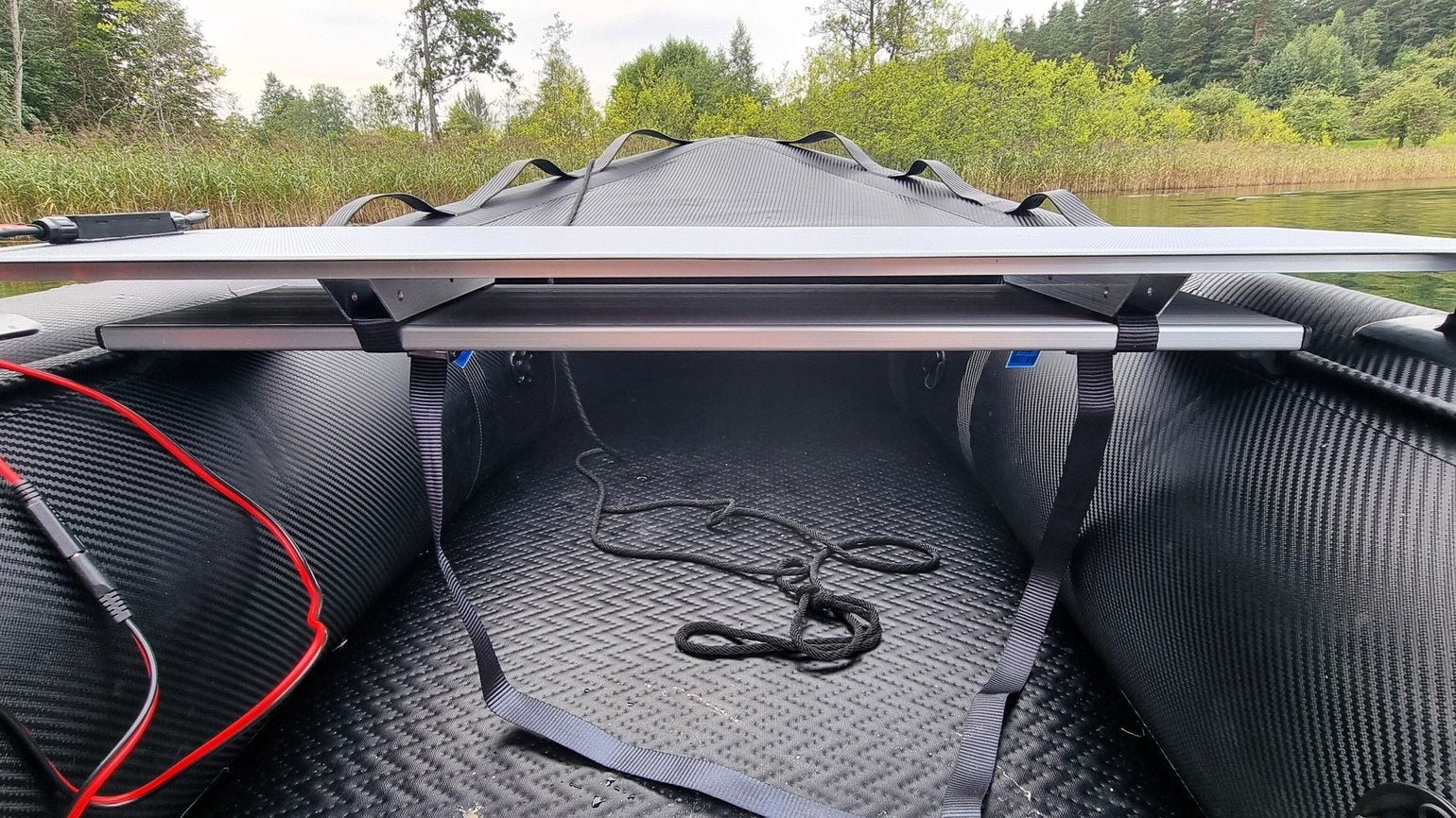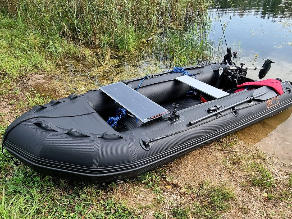 The solar generator is designed to recharge Gel/AGM /Li-Ion boat batteries and is a solar panel, glued to a aluminum frame measuring 295x950 mm. The result is a light, rigid and durable module, that can be installed on a bench or the sides of an inflatable or rigid boat.